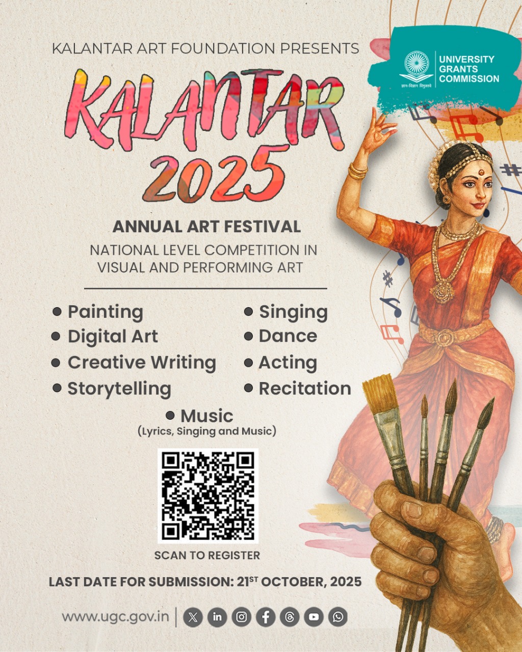 ♦ National Level Online Competitions of KALANTAR 2025 - Annual Art Festival with support of the UGC and Ministry of Education. Brochure. Registration Link.