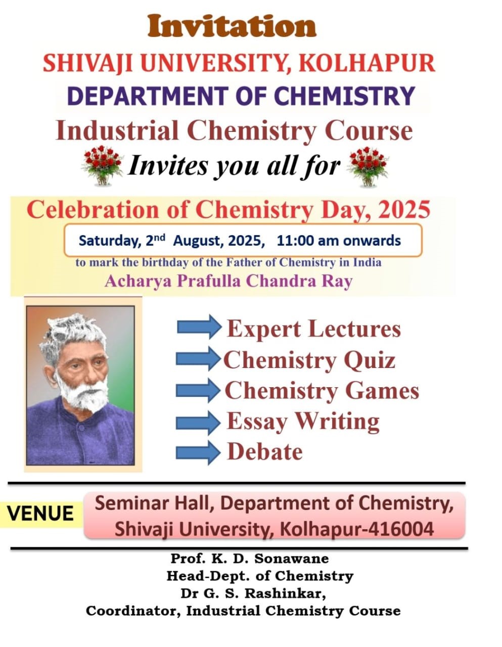 The Department of Chemistry at Shivaji University, Kolhapur, under the banner of the Industrial Chemistry Course, celebrated **Chemistry Day 2025** with great enthusiasm and academic fervor on Saturday, 2nd August 2025. The event was organized to commemorate the birth anniversary of Acharya Prafulla Chandra Ray, revered as the Father of Chemistry in India.