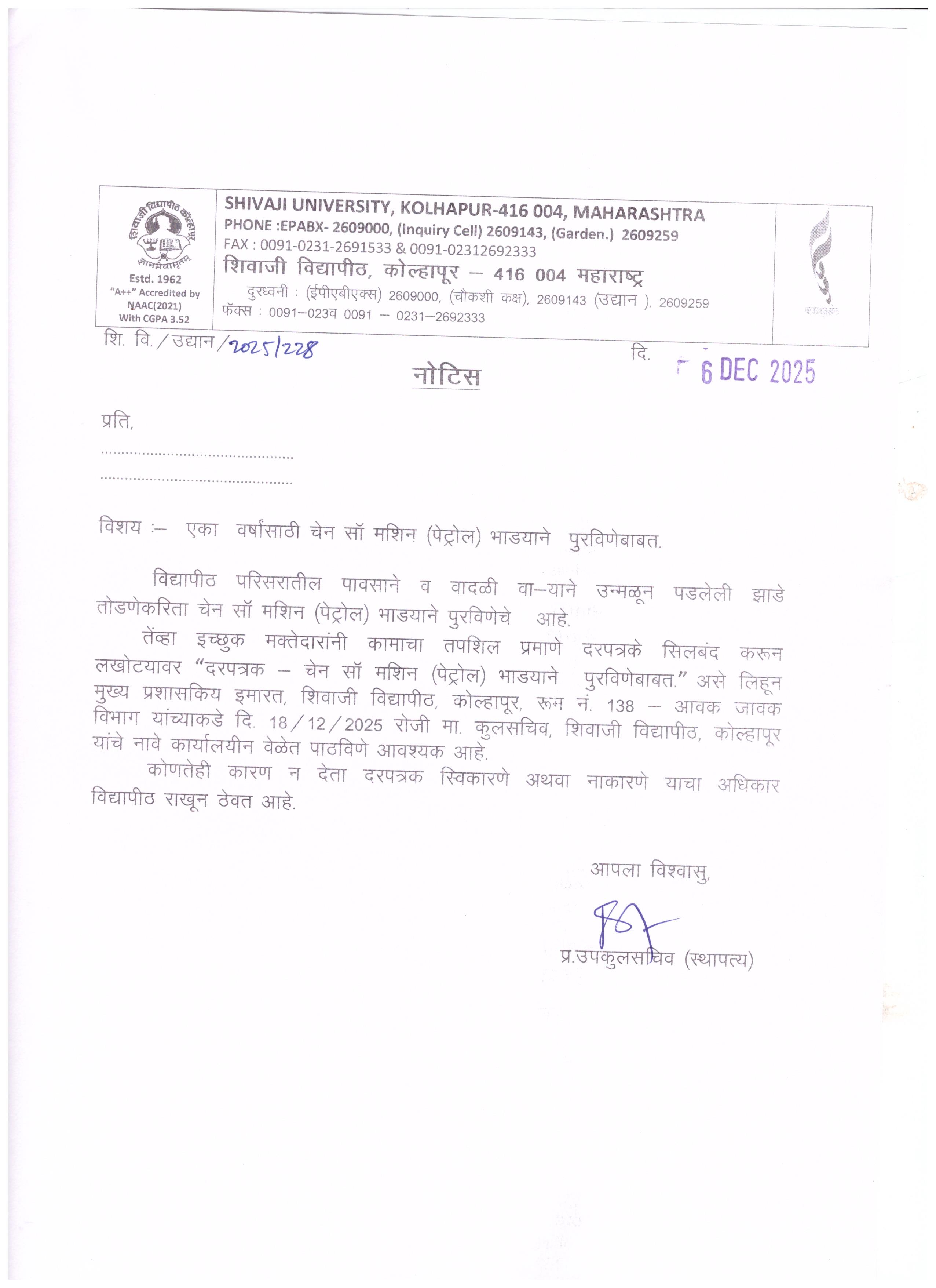 | शिवाजी विद्यापीठ परिसरातील डी.जी. सेटच्या वार्षिक देखभाल व दुरूस्तीचे कोटेशन | 16/02/2024 |