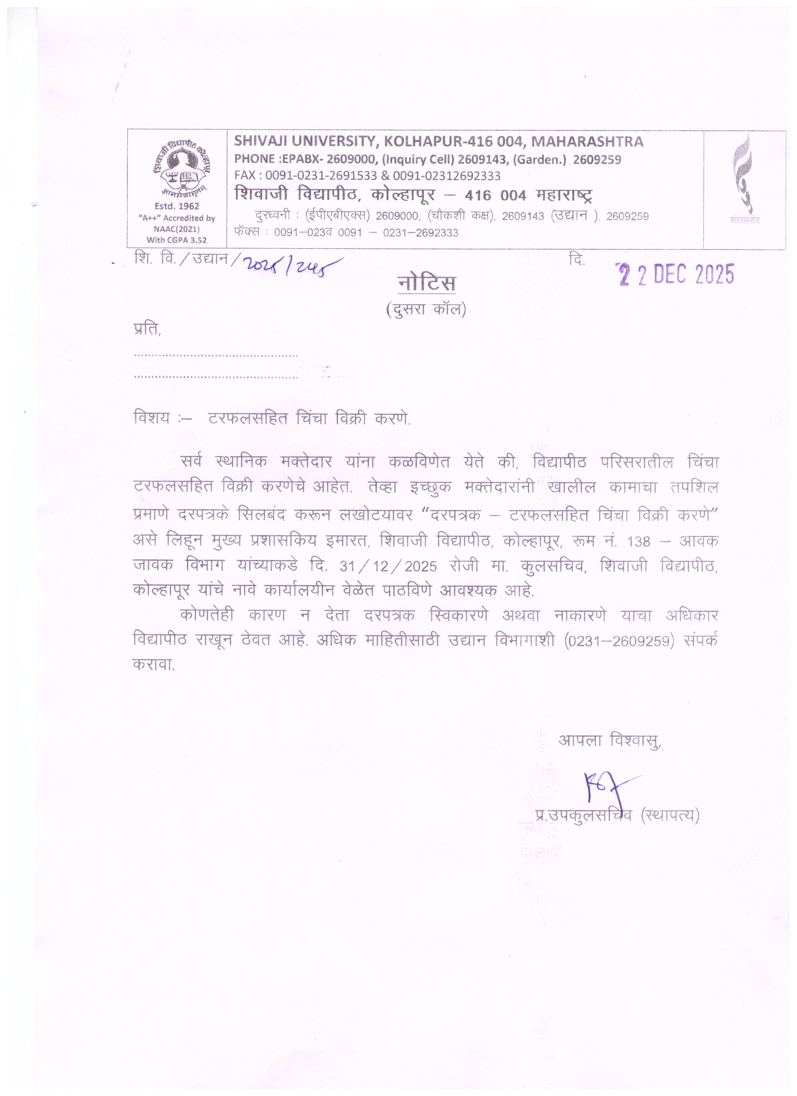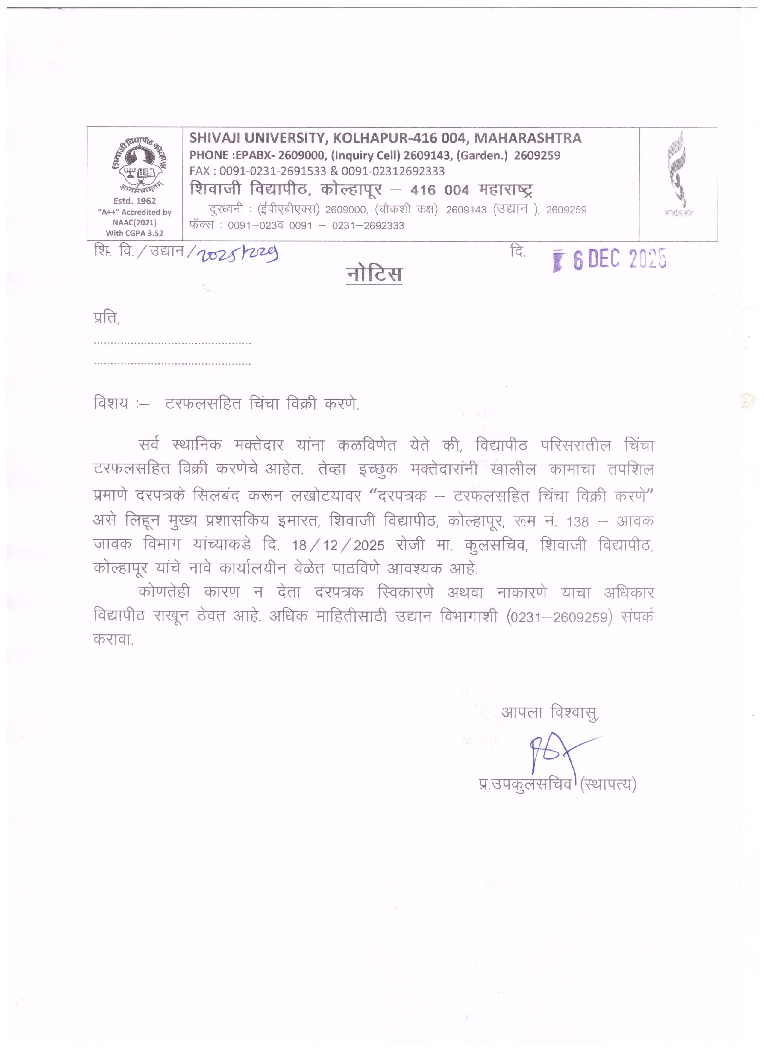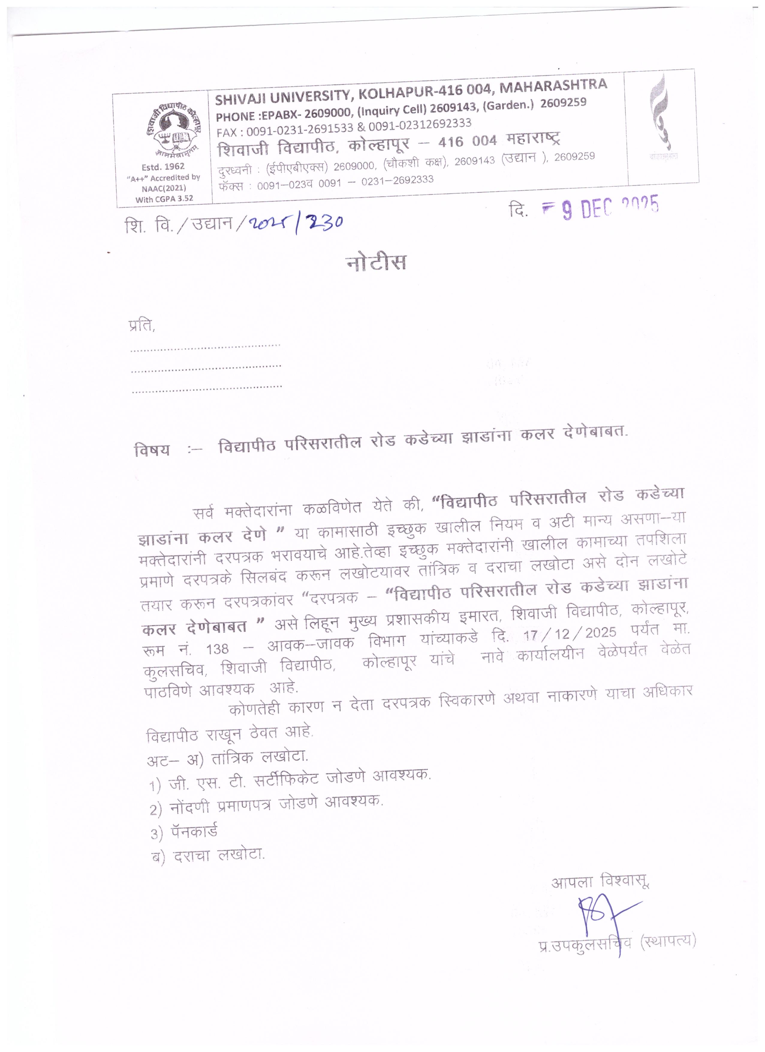 | विद्यापीठ परिसरातील रोड कडेच्या झाडांना कलर देणेबाबत.. | 17/12/2025 |