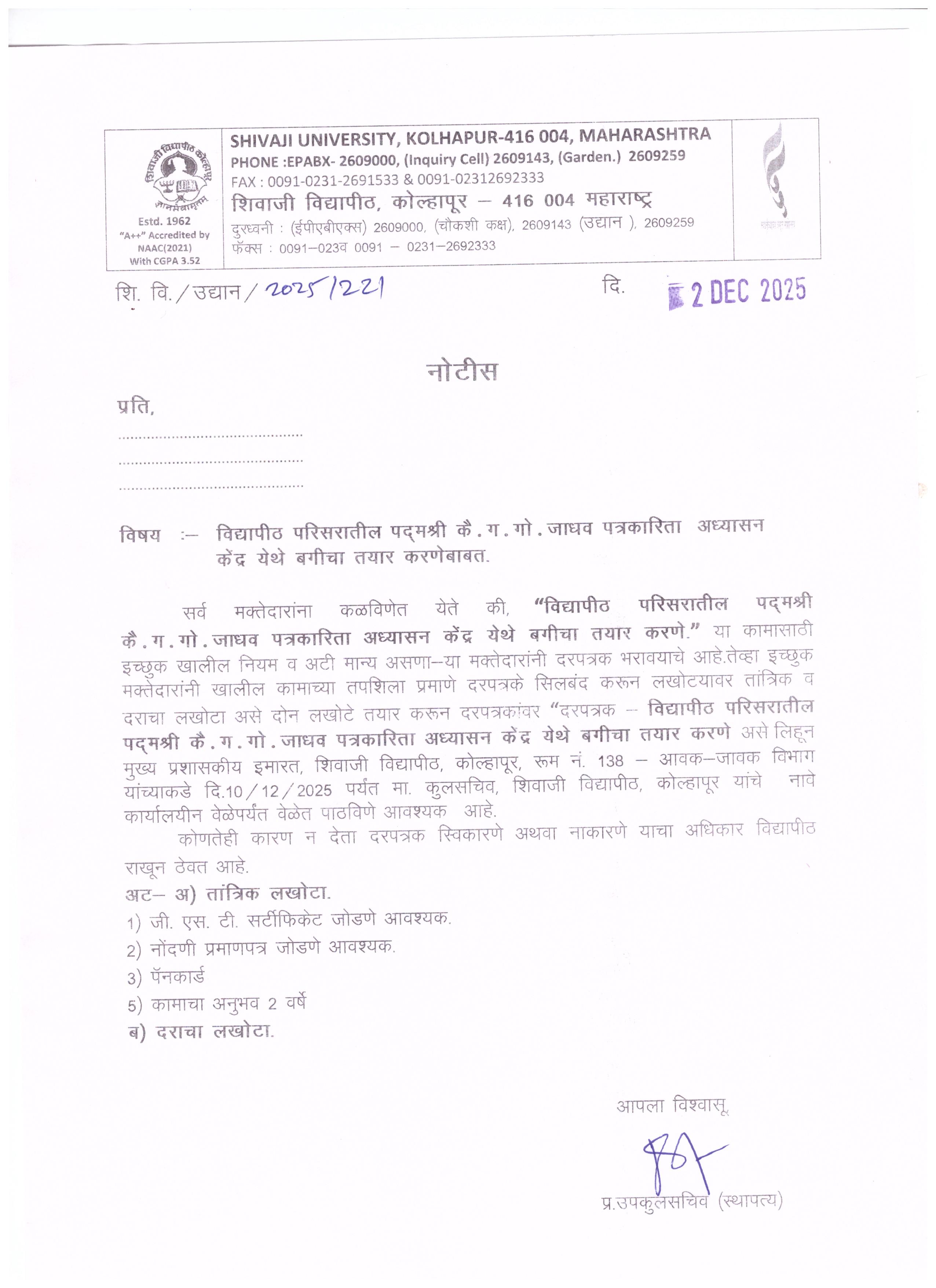 | विद्यापीठ परिसरातील पद्यमश्री कै.ग.गो.जाधव पत्रकारिता अध्यासन केंद्र येथे बगीचा तयार करणे (प्रथम मुदतवाढ) | 07/11/2025 |