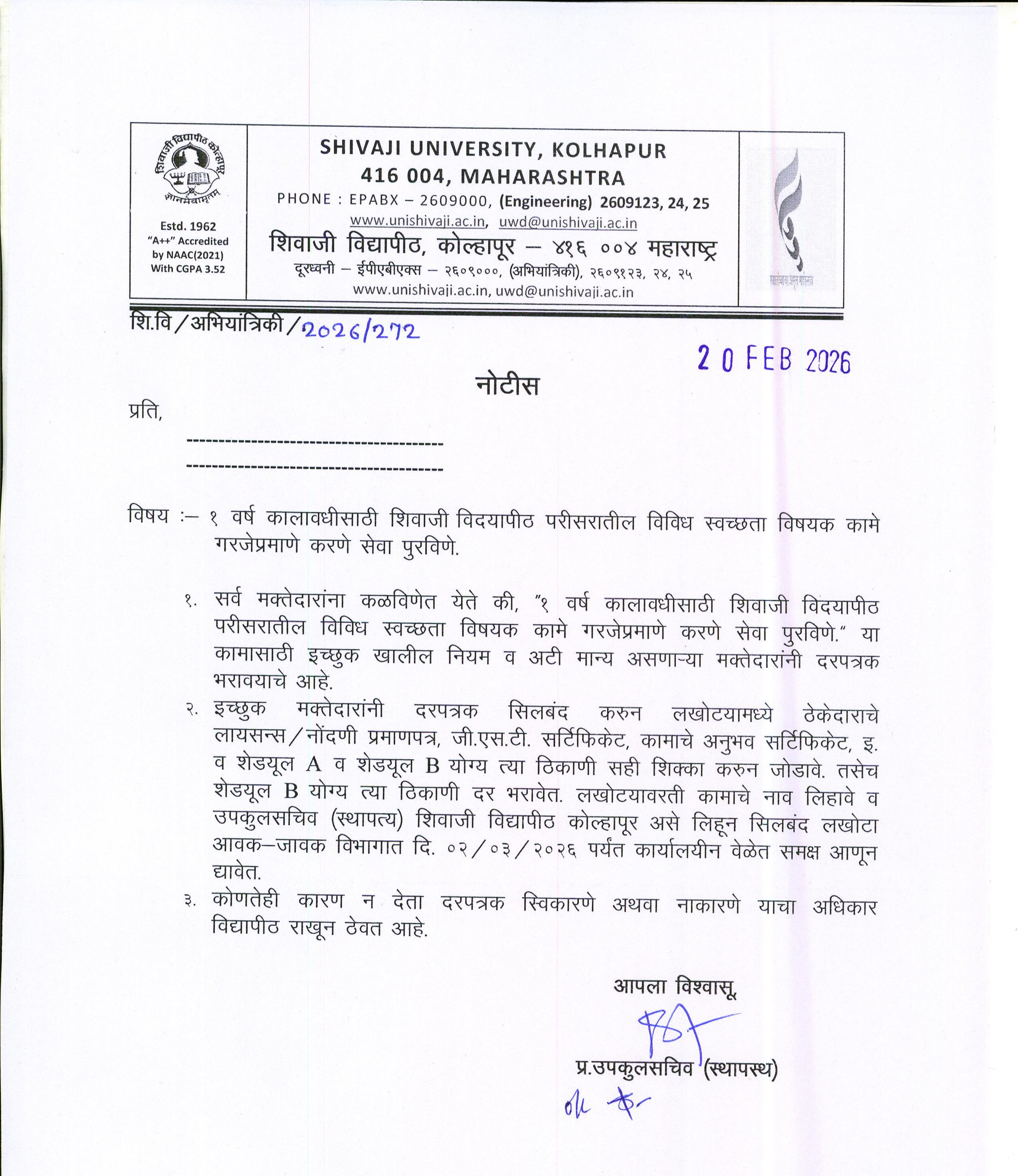 | १ वर्ष कालावधीसाठी शिवाजी विदयापीठ परीसरातील विविध स्वच्छता विषयक कामे गरजेप्रमाणे करणे सेवा पुरविणे. | 02/03/2026 |